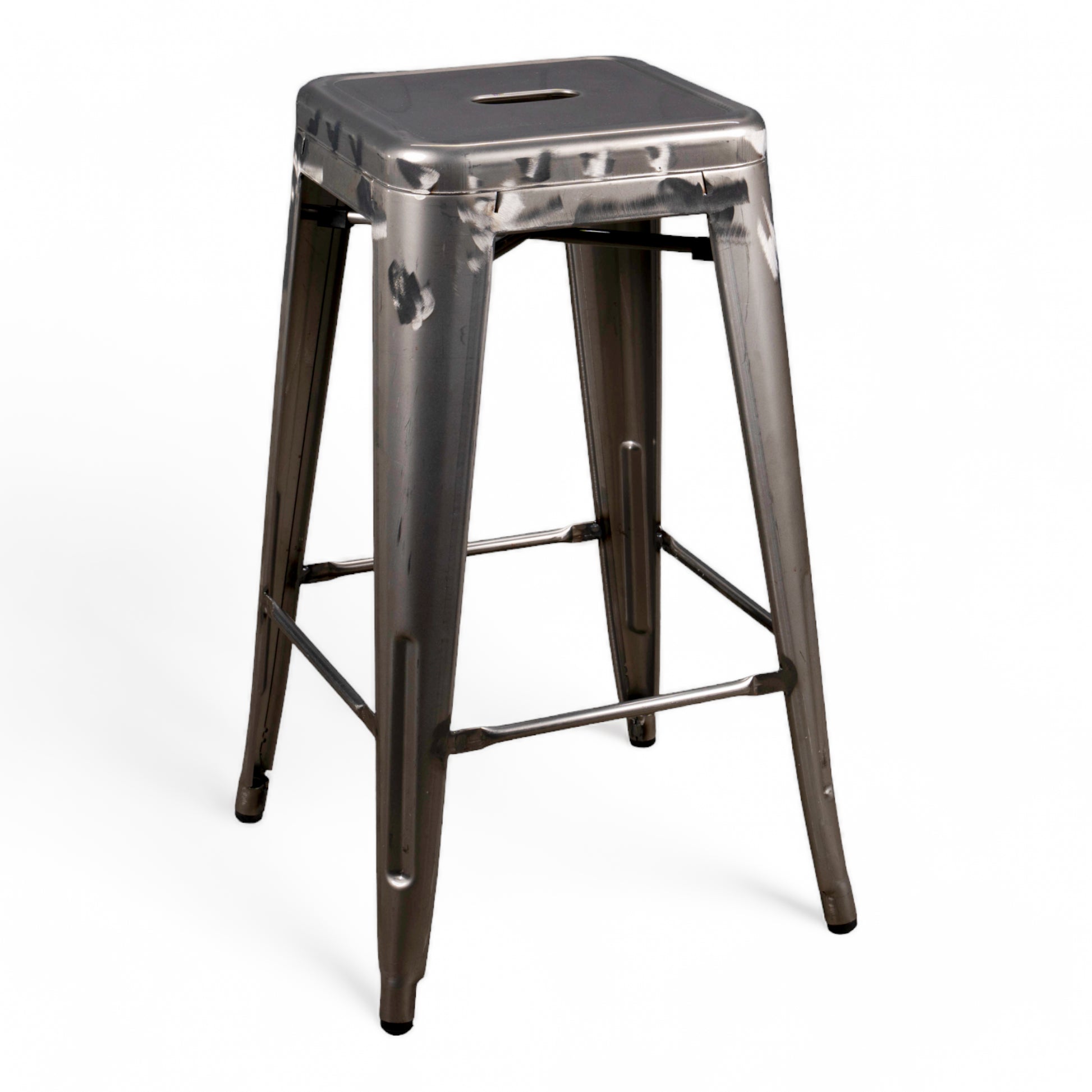 An iconic industrial style barstool with a distressed finish. Each stool is slightly different with visible welds and imperfections. Solid, robust construction. Suitable for indoor use only. Available in Gunmetal.