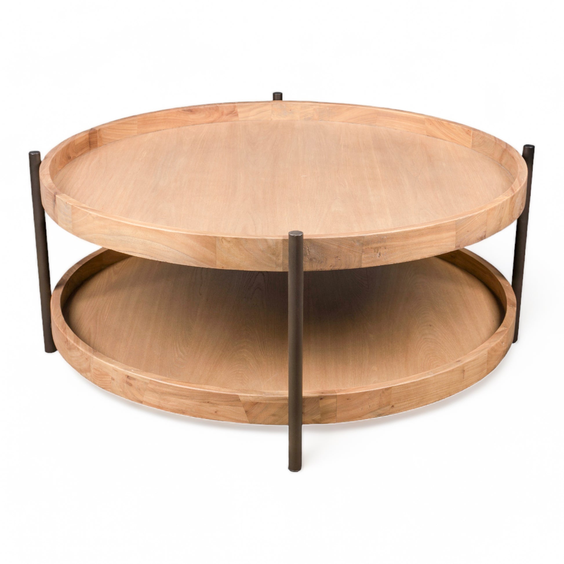 Made from American Oak with metal frame, versatile round shape with functional lower shelf to keep living spaces clutter free. Modern with an industrial edge.