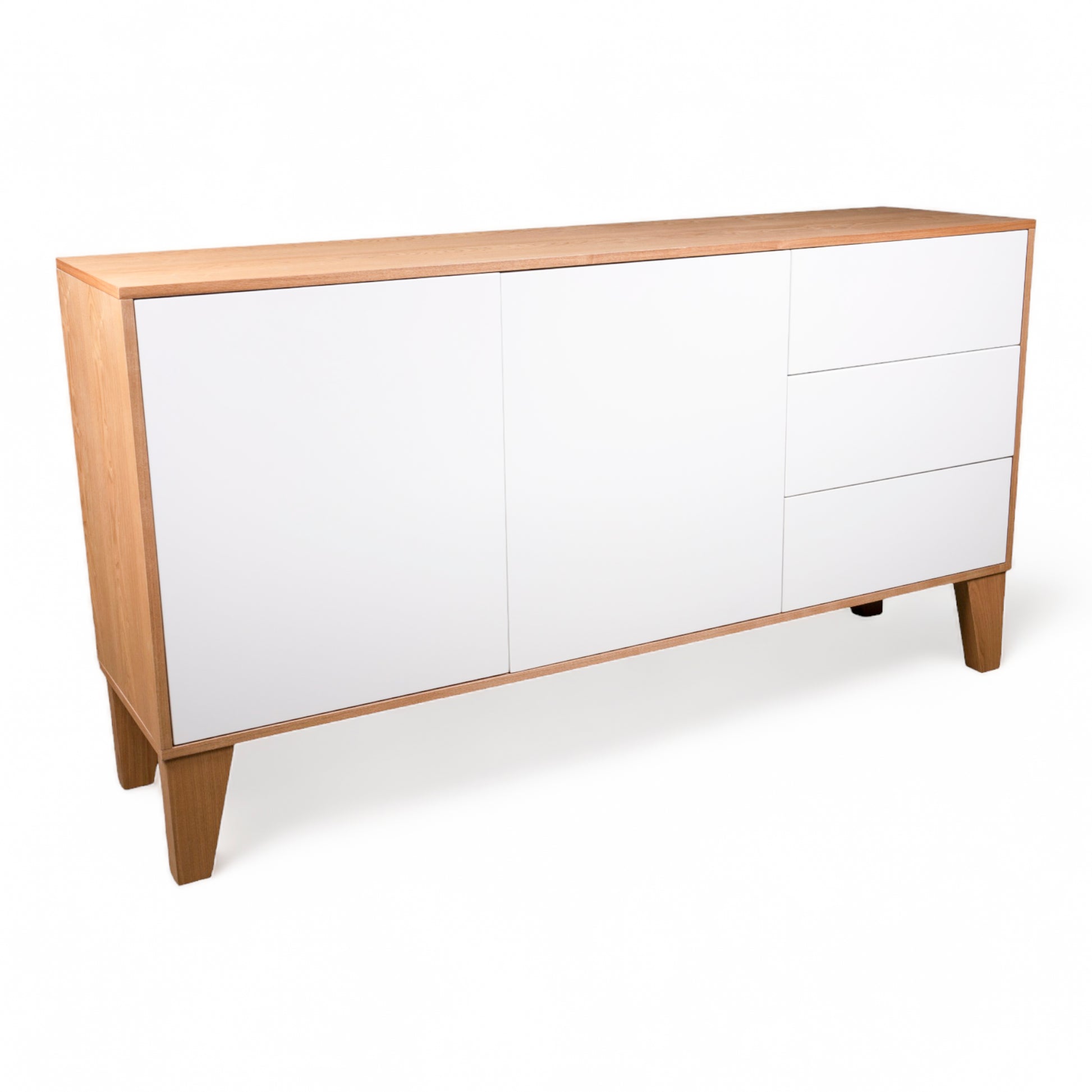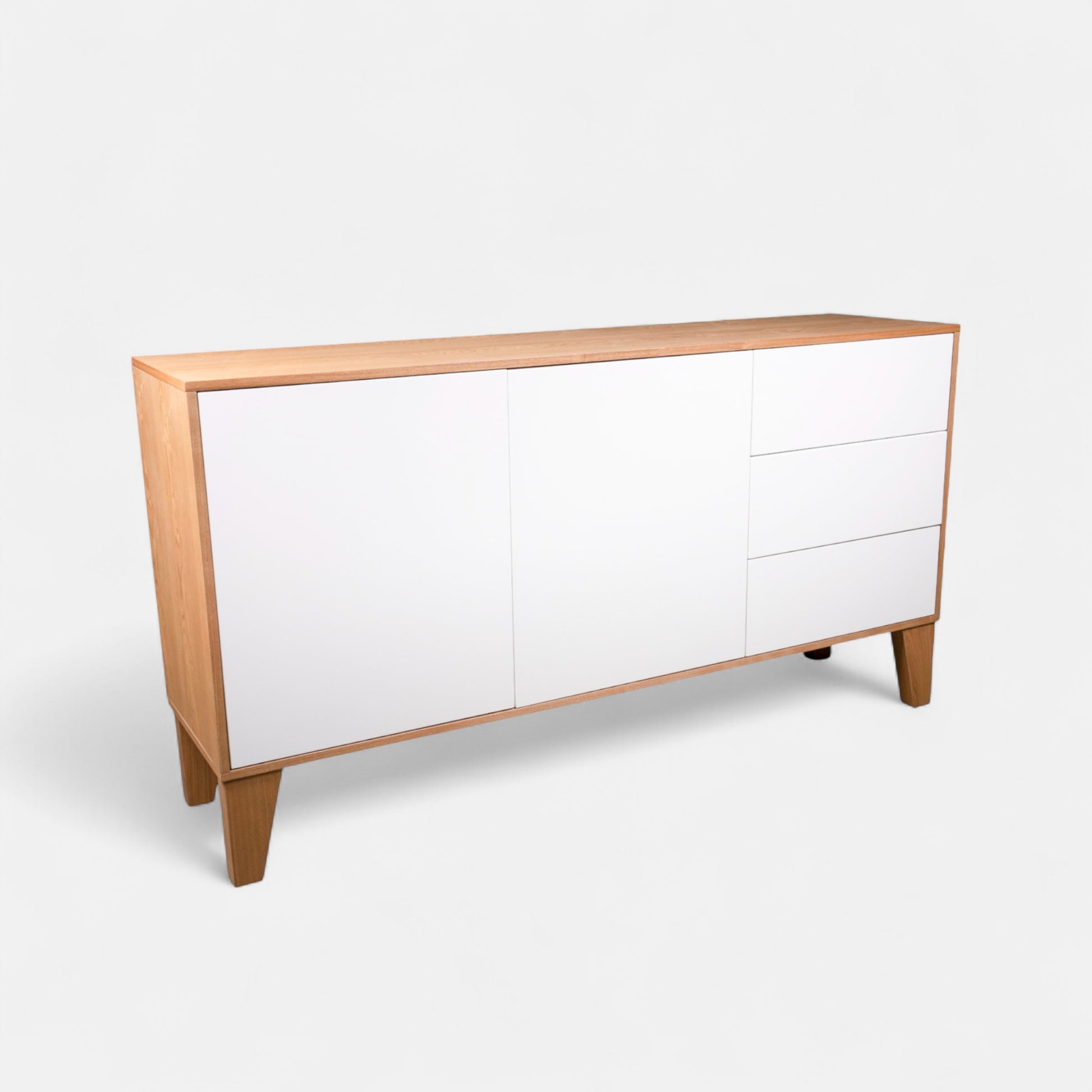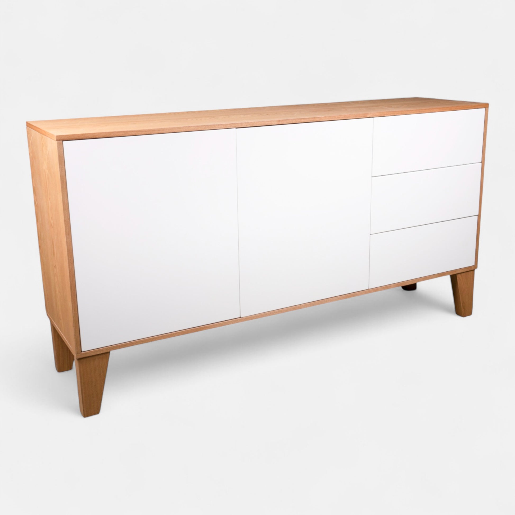 Pairs with the Berlin Dining Table. Oak veneer frame, three drawers, two cupboards in white matte lacquered finish. Includes two adjustable glass shelves for storage.