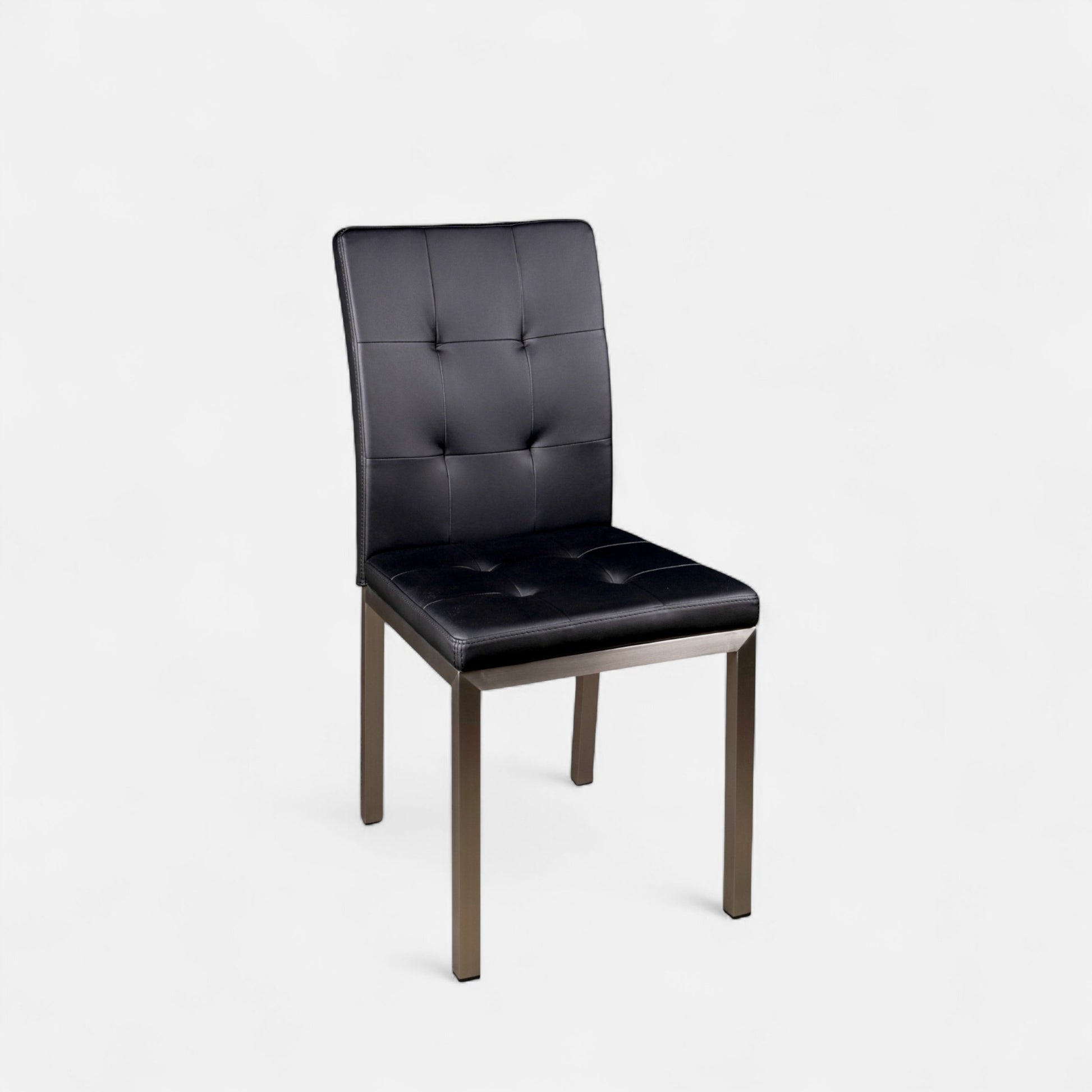 A sturdy dining chair with PU cover and brushed stainless steels legs. This chair comes in black and white.