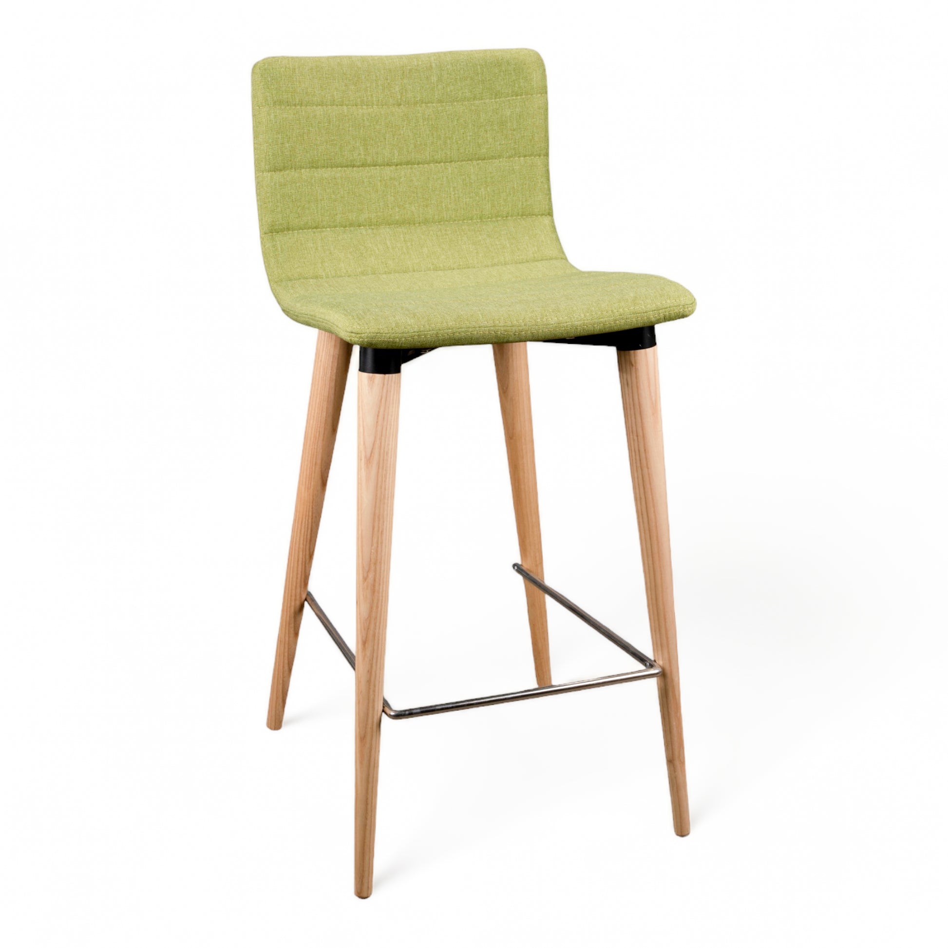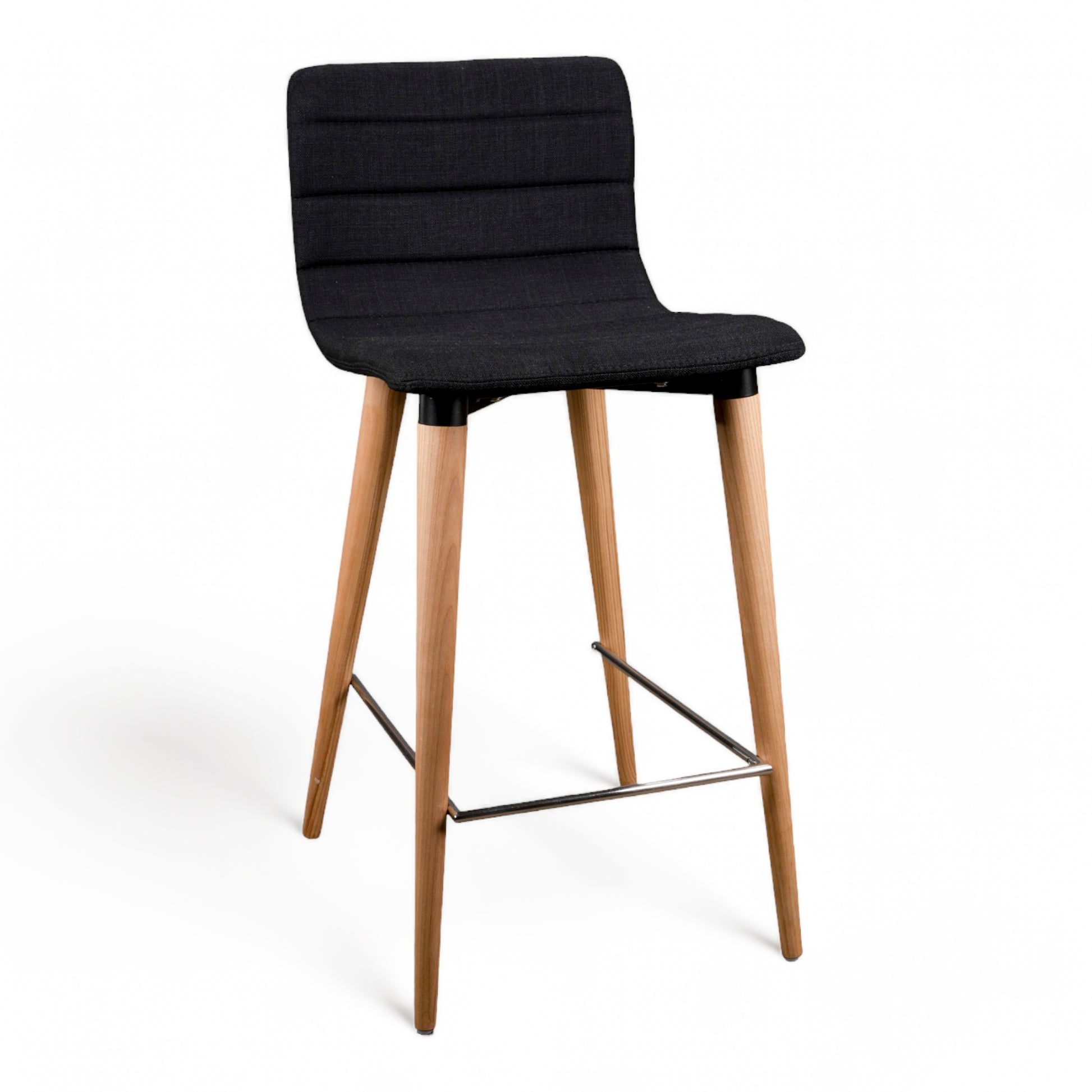 Designed with a cushioned seat and higher back for comfort. This scandi inspired barstool is upholstered in a hardwearing polyester fabric on solid oak legs. Available in a choice of three colours.