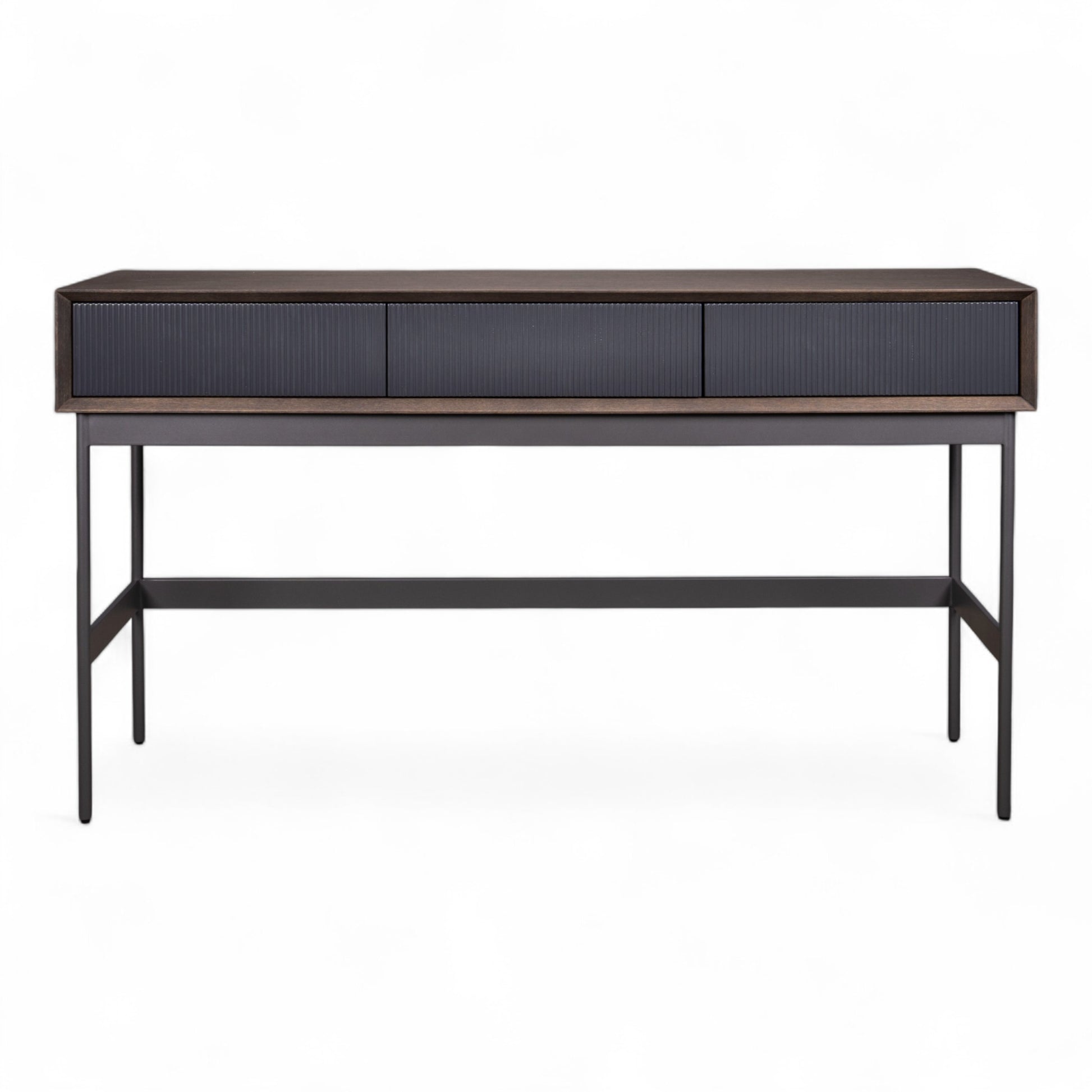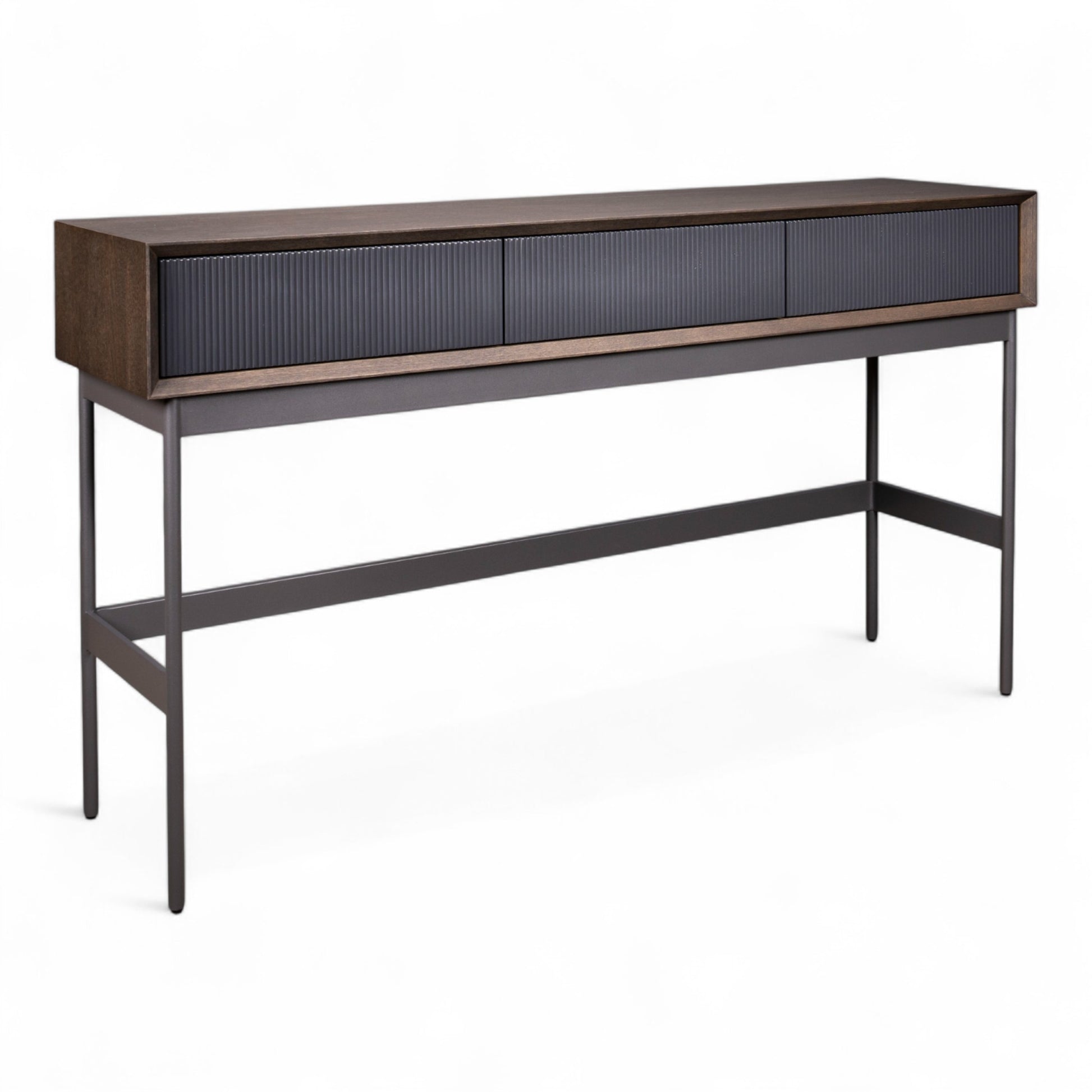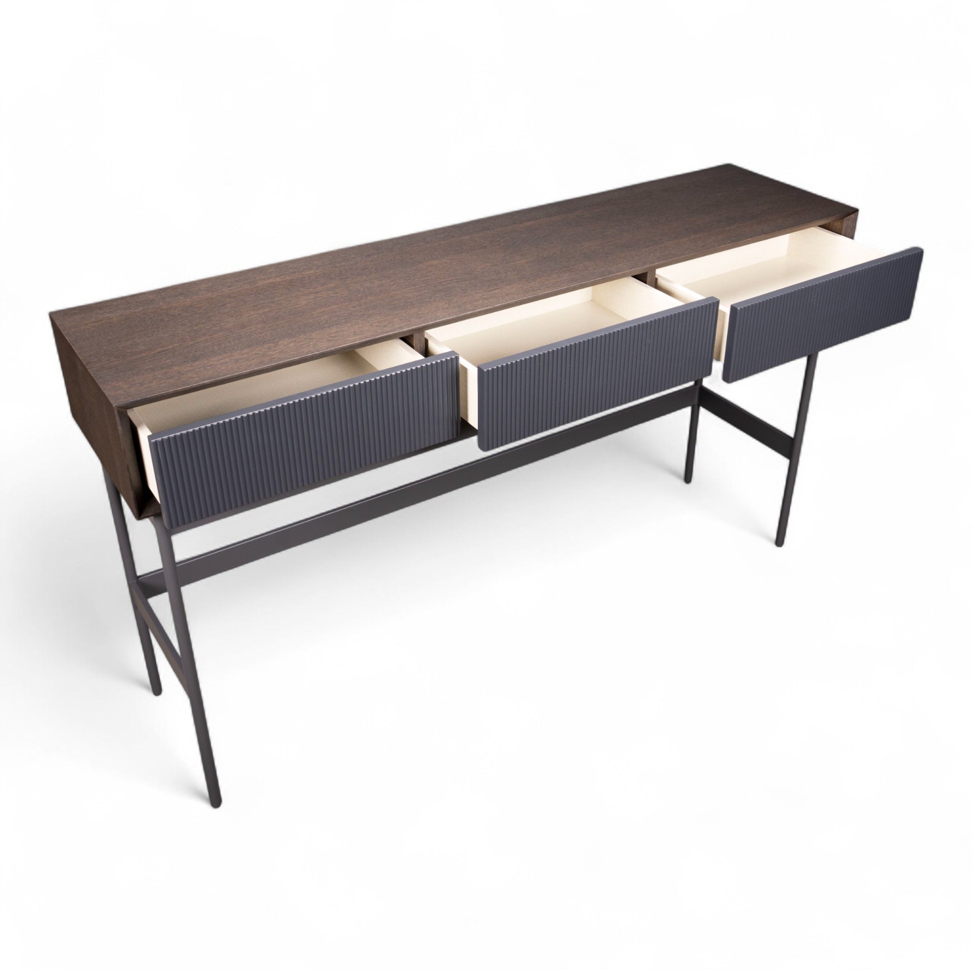 The Lucca Console is a refined blend of natural elegance and modern design. Its frame is crafted from elm veneer, the door panels feature a striking grooved texture, finished with a matte paint that contrasts beautifully with the natural wood, adding depth and character to the overall piece. Having two ample drawers, perfect for organising your essentials. With its sleek silhouette and contemporary style, the Lucca Console is a perfect addition to any living or foyer, bringing both functionality and timeless sophistication.