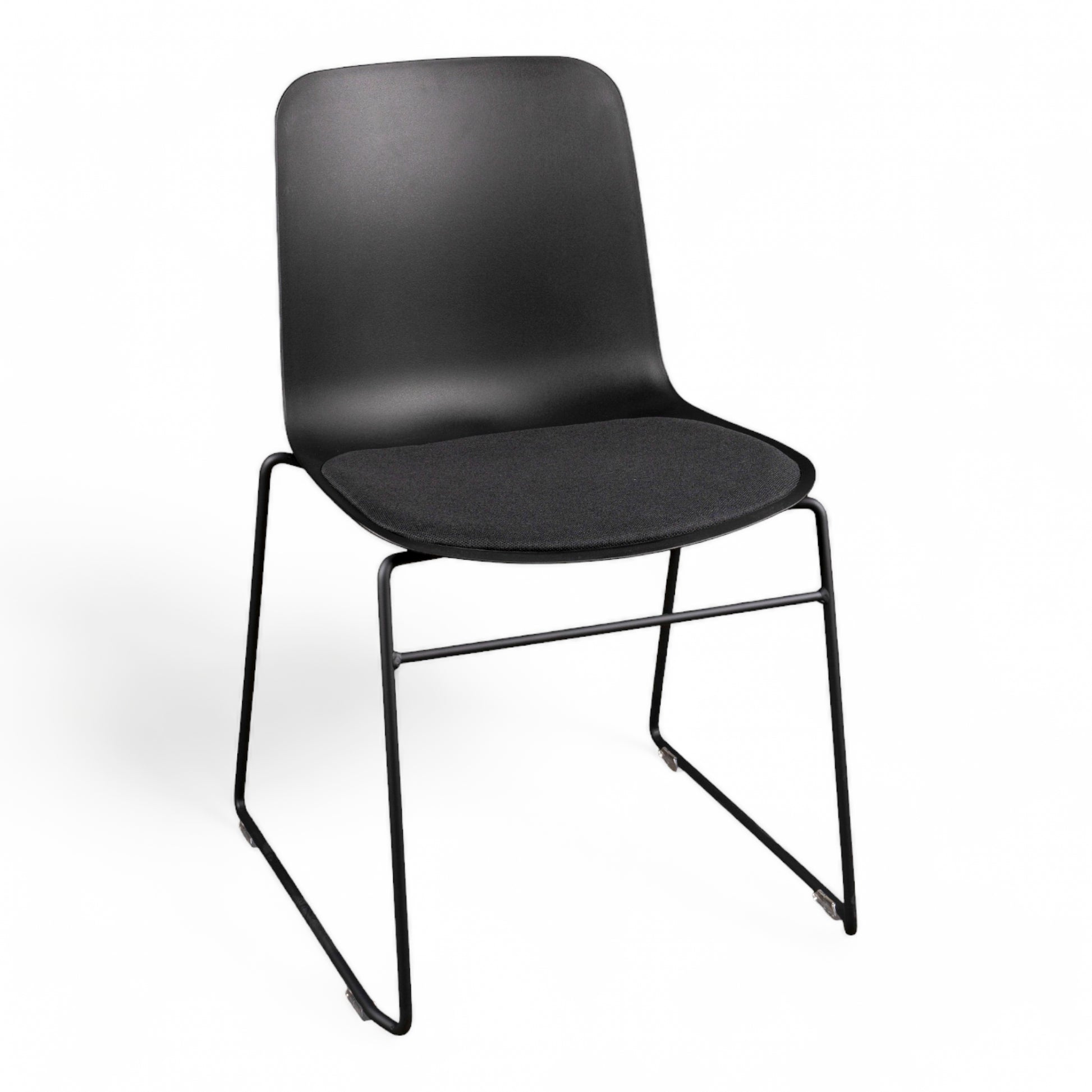 A stylish Polypropylene shell with black powder coated legs and built in seat cushion. Also available in white with white powder coated legs and black seat cushion.