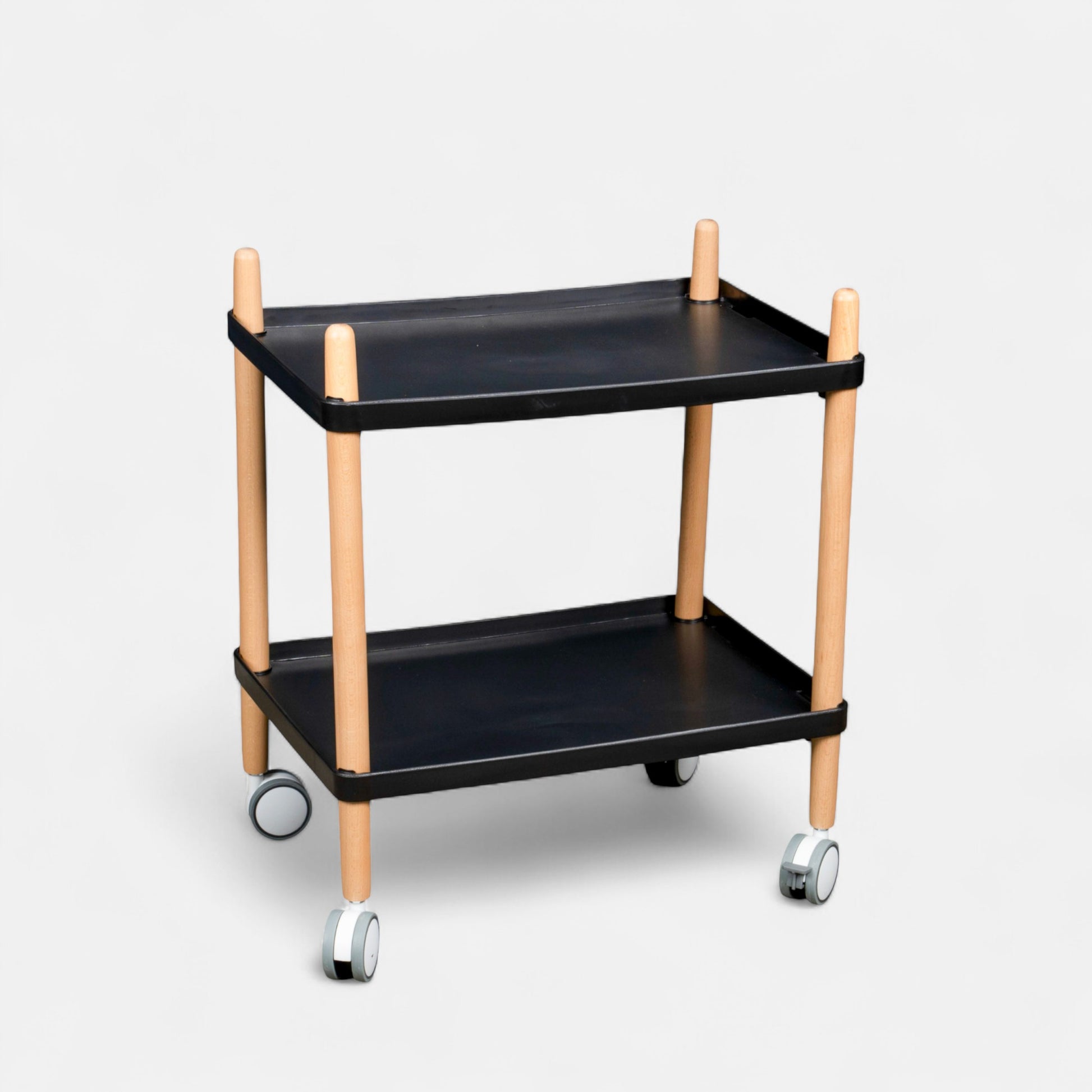 Available in two colourways with two shelves, the Asko Trolley is versatile and easy to use. Polypropylene shelves and light oak legs. Lockable castors. Black or White.