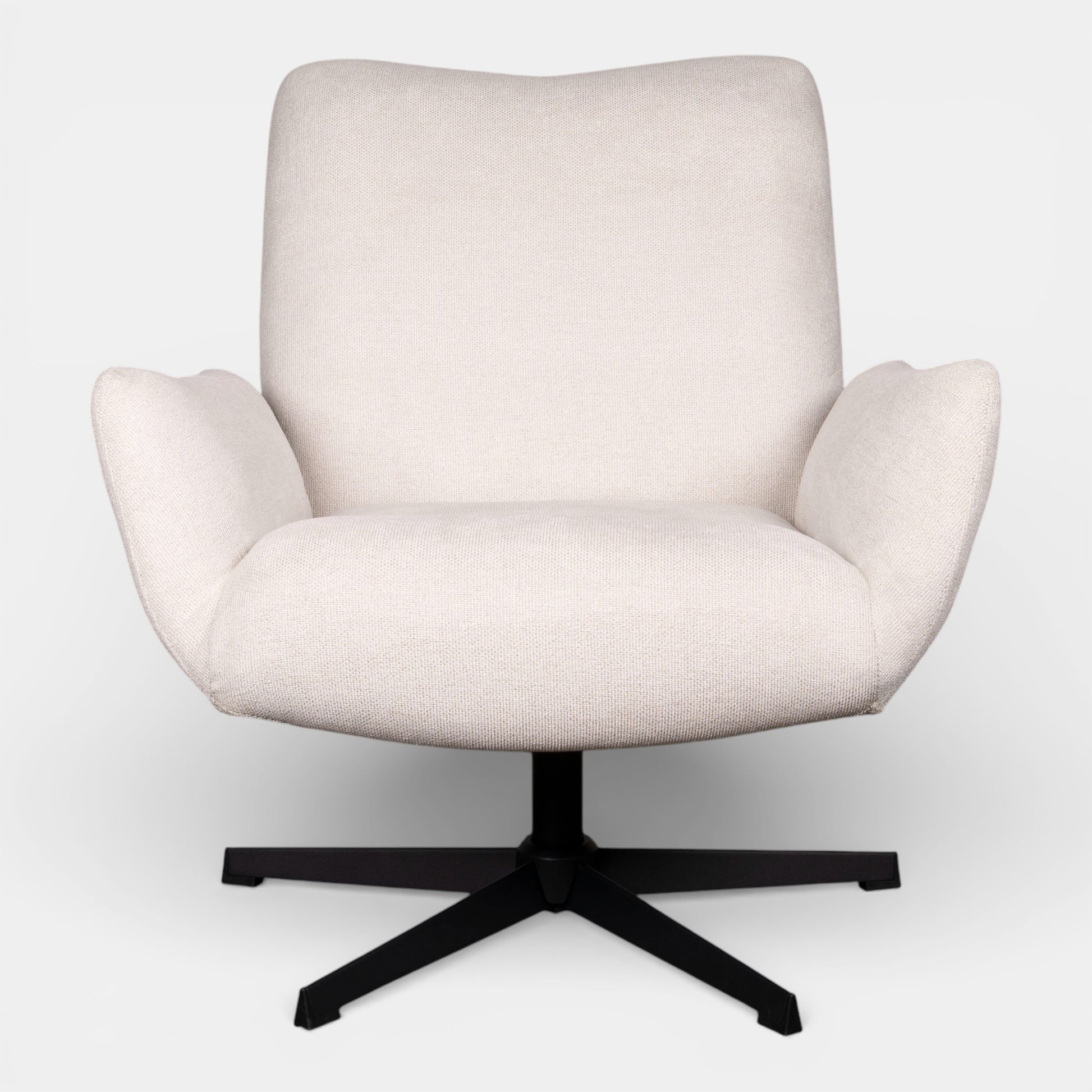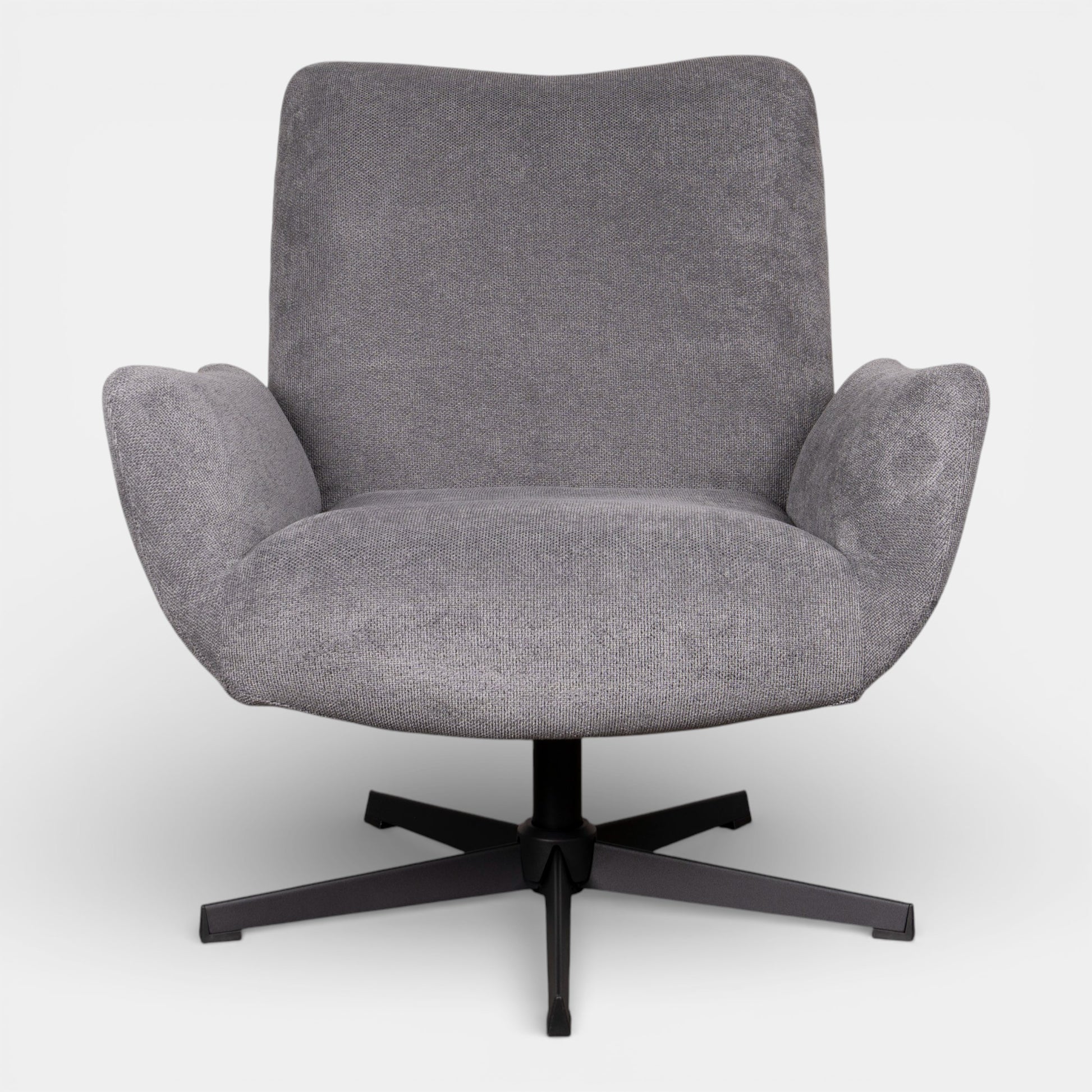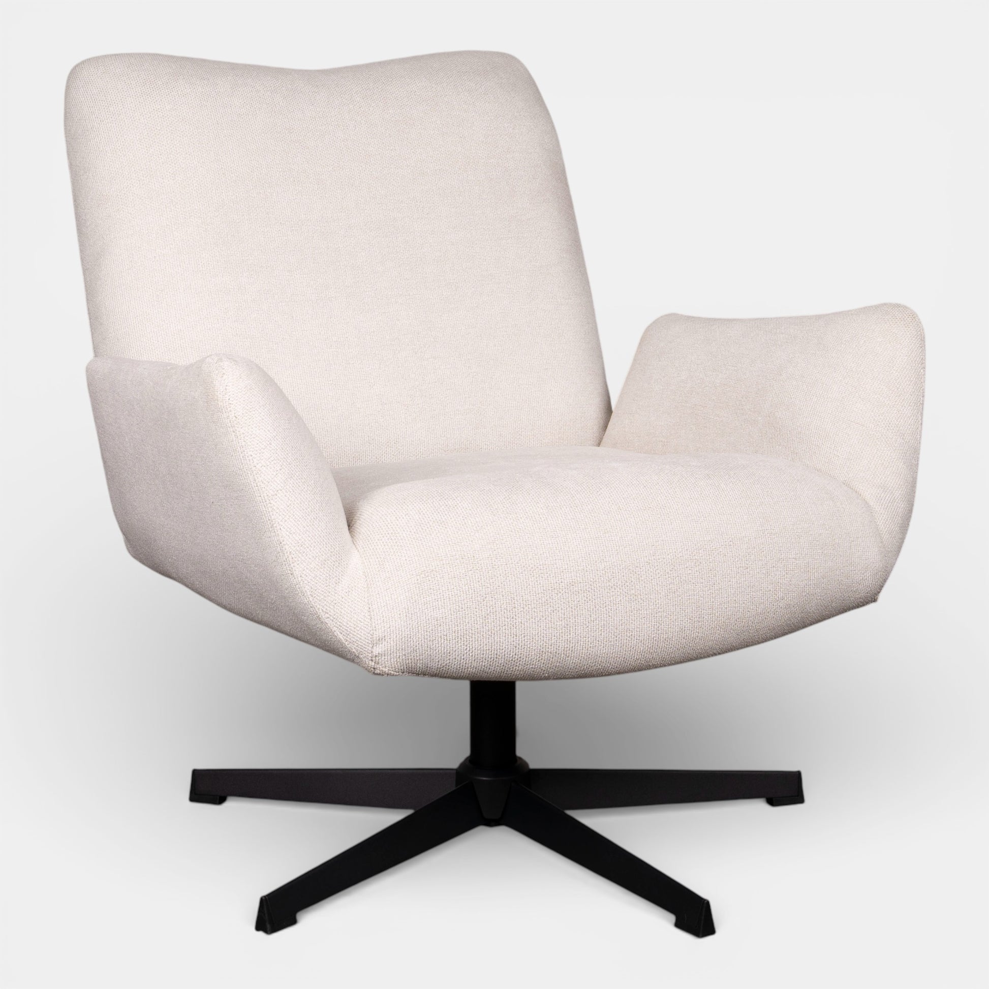Upholstered in a soft-touch fabric, this swivel armchair combines comfort with modern functionality. Its curved form invites you to relax, while the smooth swivel base allows for easy movement — perfect for flexible living spaces or reading corners.